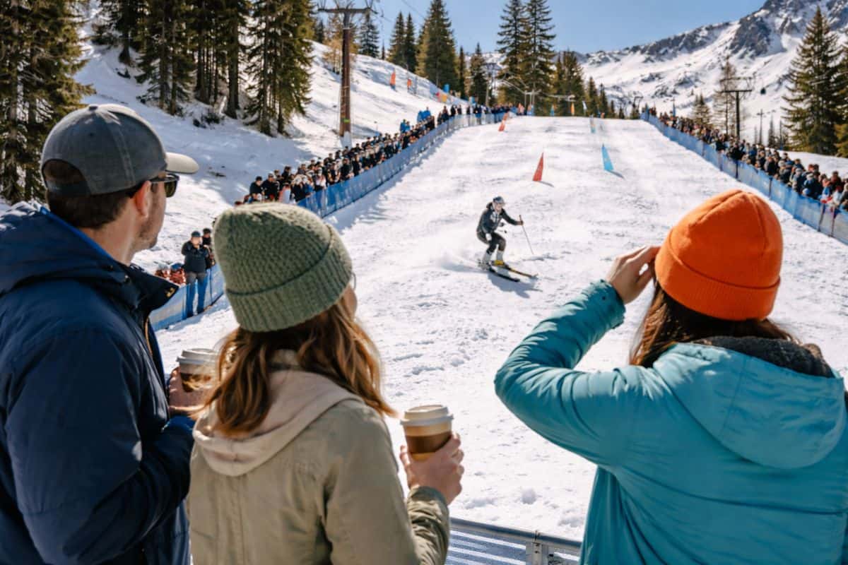 The Toyota U.S. Mogul Championships bring competitive skiing to Palisades Tahoe. Spectators gather to watch athletes race down steep slopes while enjoying late-season snow and the upbeat energy that comes with springtime in the mountains.