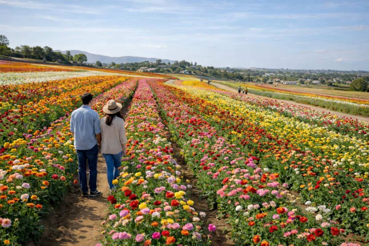 The Flower Fields at Carlsbad Ranch bloom with rows of bright ranunculus stretching across rolling hills. Walking paths and wagon tours let visitors explore slowly, making it easy to enjoy one of Southern California’s most recognizable and photogenic spring landscapes.