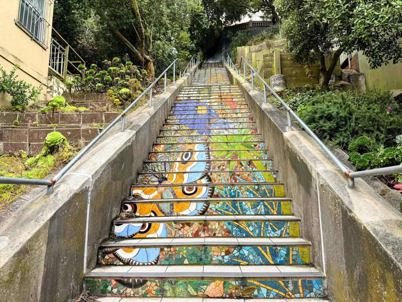 The mosaic steps, also known as the Moraga Steps, is a 163-step staircase leading up to Grandview Park in the Golden Gate Heights neighborhood in San Francisco. The stairs are decorated with beautiful mosaics and are located between 16th Avenue & Moraga Street.